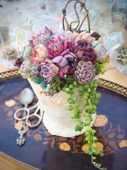 多肉植物寄植え ■作品内容多肉植物の寄植え ■こだわりポイント昨年12月に寄席たときのものですオシャレな白い鉢が映える色合いを選んで寄植えしました写真も背景に光が入ってとても綺麗に撮影出来ました