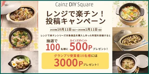 レンジで楽チン!投稿キャンペーン #レンジで楽チンレシピ」のハッシュタグを選択し投稿投稿会場はこちら注意事項※参加条件、応募方法を満たしていない場合は無効となりますのでご注意ください。※対象商品の購買履歴が確認できない場合は選定対象から除外させていただきます。※当選者の発表はポイントの付与をもって代えさせていただきます。※カインズポ