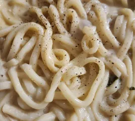 昨日の残りで 昨日の鍋の残りでカルボナーラ風うどんにしました🍝