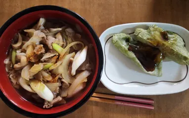肉うどん 肉少なめ肉うどんと草餅‼️草餅には芋飴をかけて食べます😊
