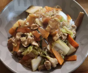 あんかけ丼 お友だちの息子さんが中華屋さんでバイトをしていて餡を貰ってくるそうでお裾分けしてもらいました🎶豚肉、白菜、人参だけ足してあんかけ丼にしました。さすがお店の餡だけに美味しい😋💓
