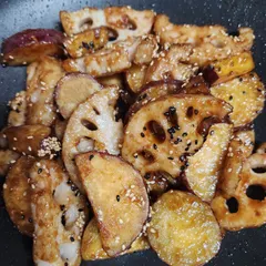 蓮根と薩摩芋の甘酢炒め 薩摩芋の季節ですね~🎶蓮根一緒に甘じょっぱく炒めました(∴)🍠