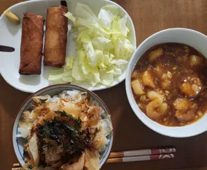先日貰った餡の中にエビチリの餡もあったので~海老と深谷ねぎを入れて🎶冷凍庫に眠っていた冷凍春巻きも一緒に❤️これだけだとなんなのでおかかと海苔をご飯にかけて食べました😊
