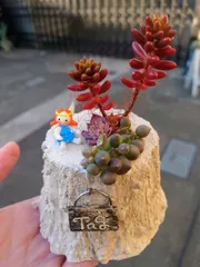 モルタルの切り株寄植え土が入るところ少ないんですけど無事に夏越しして虹の玉が真っ赤になりました💕
