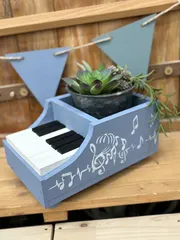 ピアノ型プランターカバー 前からずっと作りたかったピアノ型プランターカバー🎹を作りました。ヾ(๑╹◡╹)ノ"ジグソーでピアノのカーブが上手く切れるか不安でしたが、思いの外上手く切れました。🤭持参した音符🎵のステンシルもして仕上げました。🤗鍵盤もついていて本物のピアノみたいです。 最後はmilimiliさんの素敵なプ