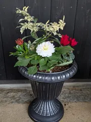 寄せ植えバイキング2 寄せ植えバイキングの花苗でダリア主役の寄せ植え作りました🤗マダムダリアレモンスワール名前も素敵🤍赤のガーデンシクラメン❤️観賞用トウガラシ ハロウィンプレミアムカザニア(ライン友達でもらえる苗)mahalo♡