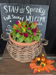 寄せ植えバイキング4 寄せ植えバイキングの苗ですが、寄せ植えせずにおひとり様植えハッピーキャドル ケイトウキモノこれだけで華やかなので単独植えにしました!ハロウィンの飾り付け🎃 mahalo♡