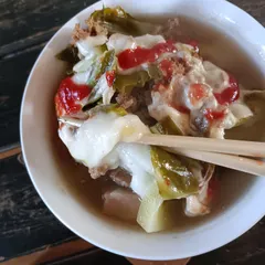 サッポロ一番塩ラーメンに、お餅とたまごと、キムチを入れて簡単に。冷蔵庫のお掃除にも😁結構美味しいです♫