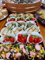 孫が喜ぶおせち料理! ■作品内容お正月の子供用おせち料理冷凍さやいんげんの白胡麻あえきゅうりとミニトマトの市販マリネ漬け生竹輪に生きゅうり差し込み門松風にカット缶詰コーン、ピーマン、ソーセージ薄味炒め ■工夫ポイント正月に娘と孫が帰ってきたので、好きな食材をリサーチして、カラフルに食べきりサイズで盛り付けました