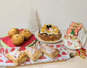 ■作品内容年に一度のクリスマス🎄スイーツを堪能したいと、ビュッフェスタイルにしたく数種類作りました。★マカデミアナッツとチョコチップのマフィン🧁★アップルパイ🍎★デコレーションVer.バスク風チーズケーキ🧀🍊★イチゴとキウイのクリスマスカラーロールケーキ🍓🥝■工夫ポイント冷やしておいた方がいい物は前
