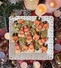 ■作品内容サンタ、トナカイ、ツリーのクッキーを作りました■工夫ポイントサンタは「どこを切ってもサンタ」クッキーを作りました。ヒゲ、顔、帽子を別々のパーツで作って、重ねると、どこを切ってもサンタさんに!また帽子の赤は食紅とイチゴパウダーを混ぜ込みました!また、トナカイとサンタさんの目とトナカイの角はコ