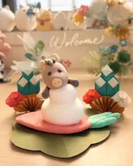 ■作品内容粘土で午の鏡餅を作りました■工夫ポイントもちもち感を出すために、仕上がりがもちもちする粘土を使用しました。また午なので敷紙は人参を作り、小さいですが尻尾もあります☺️また門松は折り紙で作りお正月感がでました✨もちもちした感触なので、ついつい触りたくなる鏡餅となりました✨
