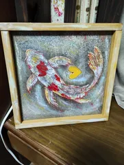 再投稿だったらすみません。今日はいつも寝室の枕元に飾ってあるフレーム付サインボードハートを入れてアレンジしてあります。鯉は出世魚。縄張りを持たない平和の象徴だそうです✨錦鯉のように優雅に生きてみたいものです✨