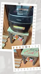 シェルフスツール このお釜はおかまレシピ用のお釜なので時短、柔らかく煮たい時使うので、奥場所が無くて作ったのがきっかけで今ではとても便利です。下が棚になっておりは缶詰や油などおいてます…使う時どかすので柄が見えてスプーンやフォークの柄キッチンだぁーと感じます!