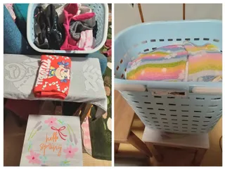 折りたたみ二段シェルフ、洗濯物畳に使用その時に座るためのシェルフスツールとして使っています。それと洗濯物を干す時のかごを置くのに使っています、かごを置かないと可愛い柄お気に入り!シェルフスツール飾るというより使っているという事ですね…