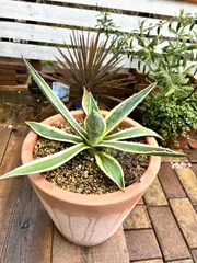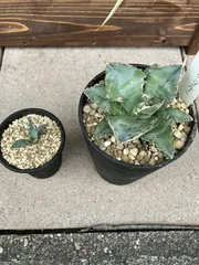 親がチタノタブルーで、メッシュのような色合いで、鋸歯もそこそこ白い。子株出来ていて、鉢から出したら黒ビニールカップの二重鉢だった。土を変えて子株は根も出てないけど、小さい鉢に入れてみた。親にそっくりな柄と鋸歯。可愛い!普段花の写真のやり取りするおばさんがくださいって言って来たが、アガベはごめんなさい