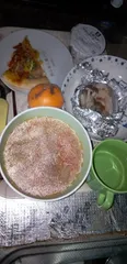 マグロのカマを使った夕飯。😺 冷凍のカマをバスツアーで頂いたので。ハナミズキさんに教えて頂いたので、早速調理してみました。マグロのカマにピンク岩塩を少々振り、お野菜にぶなしめじとニンジン、玉ねぎとフライド玉ねぎを添えて。オーブントースターに、その後フライパンで蒸し焼きにしました。仕上げに、味ぽんをかけて。美味しく頂きました。&n