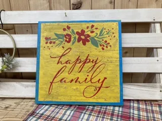 アレンジアワード2022【ミニサインボード】 本日は、雨☔️でも、心は晴れやかに、ワークショップに参観してきました☀️今月から姫路大津店でも始まった、【ミニサインボード】を作ってきました👍 木材にダメージ加工をして、ベースカラーを決めて、さあ!いよいよ、背景のカラーとステンシルのカラーを決めるのですが、センスのない私が、上手くカラーを