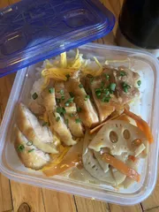 いつの頃からか、可愛いお弁当箱からタッパーになってしまいました。職場にレンジがあるとの事…いつも茶色弁当になるので、ネギを散らせばいいと思ってます🤭