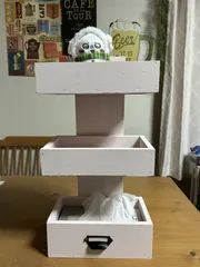 テーブルシェルフ3段 テーブルシェルフ3段を作ってきました😄初めてする隠し釘で箱を作っていく方法で🔨でさしてその後が大変で隠し釘の頭に付いているプラを🔨で叩いてとると言う作業が難しく大変でした😩一回でカーンと取らないと釘が曲がって失敗😮💨出来上がって良かったです🎶色は娘希望のソフトピンクで🩷下の段はティシュBOXがピタ