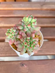 花火✨✨ お迎えした時は本当に小さな苗だったので暑い夏を乗り越えてくれるか心配しましたが、なんとか乗り切って今ではこんなに可愛くなりました❤️交配は分かりませんが、この子は乙女ちゃんが入っているのかな⁇先っぽのぽっとした赤いほっぺが乙女ちゃんそっくり❣️可愛いなぁ🥰❤️❤️