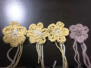毛糸で お花のモチーフ編んでみました。 編み物なんていったい何年ぶり😅でもやってみたら覚えてました。忘れないものですね😄