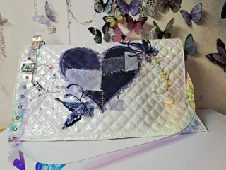 ショルダーバック ■作品内容 キルティング素材で、気軽にお出かけしたい気分にさせてくれるバックをテーマに作ってみました■こだわりポイント ⭕肩掛けの部分をビニールベルトにしたところ ⭕蝶の刺繍の回りにビーズ、スパンコール、花、チェーンを使い、あえて光と影で表現してみたところ まだ、書き方が上手く