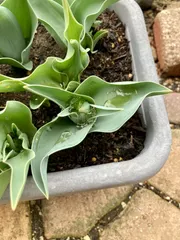 みなさんのチューリップ🌷の花が咲いた投稿見ていて、我が家のチューリップを覗いたらやっと蕾が顔を出してきました😆 昨日の雨で溺れそう😆 咲くのが楽しみです😊