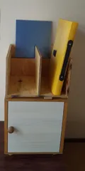 「アレンジアワード2022【とびら付きBOXに重ねた本棚】」 BOXが気にいっており、汎用性を考えて上に重なる本棚を作りました。①材料 端材②組み立て仕切りを設け、前側にはファイルや書籍等を収め、後側には、クリアファイル等の薄い物を収められる様に2分割で作成③ペイント木工オイル④組み立て完成⑤完成品⑥とびら付きBOXに重ねて使用