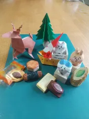 端材で彫刻 折り紙とのコラボ クリスマスシーズン到来~⛄️🎄✨ SMSを参考に初の折り紙にもチャレンジしました😃🎵 これまで彫ったお気に入り作品とのコラボです~~優しい目で見てください~😀😵💧