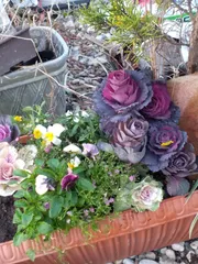 迎春の寄せ植え 葉牡丹 ストック ビオラ 白妙 斑入りヤブコウジ アリッサムで作りました。