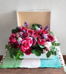 アレンジアワード2022【お家の花でFlower Box】 家の金魚草がピークを過ぎそうなのでFLOWER BOXにしてみました❣️ラベンダー や石竹(撫子かな?)も元気だったので入れてみました🎵金魚草はどこへ❔😅