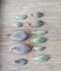多肉の葉をポイっと手作りのトレーに置いています。一部ですが小さく芽が出てきてます🌱取れた(取った)葉から出るミニサイズの赤ちゃん多肉が可愛くてほっこりします。(*˘︶˘*).。.:*♡