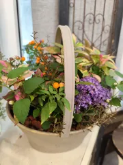 ハロウィン🎃の寄せ植え👻 🎃ハロウィンの寄せ植え🎃 昨日の午後に前橋小島田店で参加してきました🎶 カゴ🧺やバスケット、アイアンに寄せ植えするのが大好き❤
