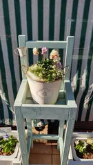 チェア型グリーンスタンドとプランターカバー グリーンスタンドにパンジーの寄せ植えを飾りました💕 パンジーはカインズ購入のフリフリが可愛い"ゆみ"可愛さ今年No.1♥️ グリーンスタンドの両サイドにはパンジーを植えたプランターカバーを置きました。100均のバークチップで土隠しビオラを植える予定でしたが、花色で迷い、パンジーを