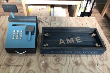 レトロレジTOY & ボックストレイ こんにちは😃今日の午前は、富谷店にてレトロレジ、午後は、仙台港店にて、ボックストレイを楽しんで来ました。 レジは、エボニーブラックと、ブロンズグリーンです。午後のボックストレイは、ブラックと、オリジナルブレンドの、ゴールド(...に見えますでしょうか?) その際、先日のインテリアチェアにステンシル