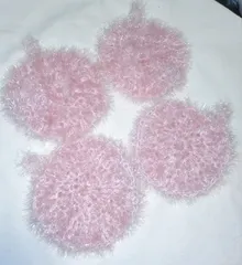 たわし用ヤーンで作ってみたよ☝️100均 ポリエステル100%の、たわしヤーンの毛糸をダイソーで見つけて早速タワシを作ってみました☝️ 30gで4つできました。厚みもあり、洗剤を付けても泡立ちよく使い心地よいです❤️ 秋の夜長にいいね🌛