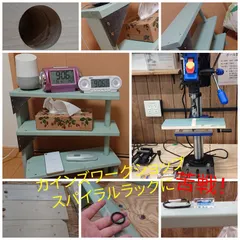 スパイラルラック⭐カインズワークショップ ワークショップでスパイラルラック。今回はボール盤という穴だけ開ける贅沢な工具を使いました。片足は丸棒 もう片方はSPFです。カラーは2色可能で ちょっときめつ風に超撥水ダスティグリーンとエボ二ブラック。エボニは2回塗らないといつも色がつきません。今回は全ての薄めでもよかったので1回。エボニは2度塗り