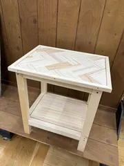 ヘリンボーンサイドテーブル ヘリンボーンサイドテーブルです。まだ、無塗装です^ ^ヘリンボーン模様の板を貼り付けてから間違いに気づき、剥がしてから再度貼り付け。焦っていたのか隙間だらけ💦サンドペーパーで擦って擦って木屑で隙間埋め。板の方向に擦れなかったから傷だらけ😅イヤでもアンティーク加工バッチリ👌そして足の部分は途中、ガタつ