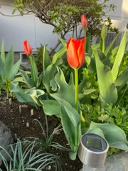 夕日があたりチューリップの赤が良い感じ〜🤗
