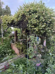 ハニーサックルの屋根の下で 今日は、しとしとと、一日中雨☔みたいですね。溜めておいたブルーベリーの🫐実を綺麗に洗って、ジャム作りをしています。何瓶🫙とれるかな⁉️3種類のナッツ入りの食パンも🍞出来上がりました‼️ハニーサックルとジャスミンが絡まって出来た、グリーンの屋根。此処がお庭の真ん中になります。此処に座ると、お花の香り、