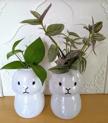 なんちゃって 100均で買ったウサギさんのポンプボトル。上の部分をカットして~花瓶風にしました✨✨