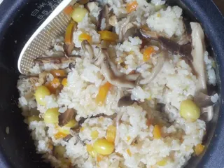 師匠のレシピ炊き込みご飯 師匠のレシピ具材を煮て、味付けしたものを洗ったお米の上に乗せ、炊飯冷凍庫の銀杏もたっぷり入れました!いい感じ😋師匠のレシピは、いつも私の味覚では「しょっぱめ」なのに今回は味が薄い🤔🤔 これは師匠の味に慣れてしまったからなのでしょうか😆😆 いただきま~~す💗