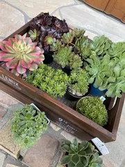 ベジタブルボックスにステンシル🎶 先日WSで作ったベジタブルボックスに前後ろにステンシル入れました😊 ベジタブルボックスですが、底が網なので通気性もいいかなと多肉入れにしようと作ったものです❣️ さぁ、何を入れようかなと、とりあえずおうちのアエオニウムたちを入れてみました🎶 黒トレーに入れていたのですが