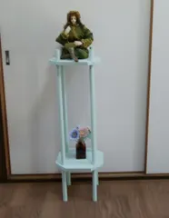 プランティングスタンド どうしても作りたくて熊谷籠原店まで行って🚗作ってきました。真四角の天板の四隅を斜めカット・丸棒を通す穴を開けて、作業は大変でしたがその分出来上がったときは感無量でした...。さっそく自作の人形を飾ってみました💕…。