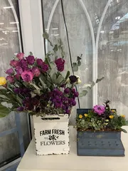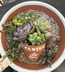 多肉植物の花束 小さな鉢は皆さんオリジナルのデザイン❗️いつか花🌸つけてほしいなー🎵と思い、、描きました、、😃多肉はあまりくわしくないので、珍しい雰囲気で、シンプルな苗を選びました❗️鉢の中に鉢、、楽しい作品ができました😊