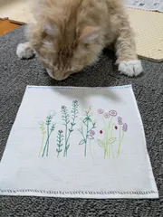 春っぽい、刺繍ですね〜🌸🌼 にゃんチェック😺かわいいです😍 ジーンズ👖、履くの楽しみになりそうですね〜 100均の刺繍キット、私、赤🟥のキット買ったんですが、そのままです😅