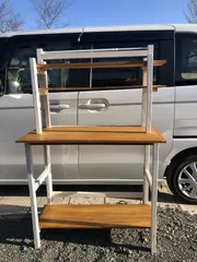 折り畳み4段シェルフ♪ box の後ろにフリマの荷物に遠慮がちに収納可能なシェルフです。高さ145センチという長さにすると、助手席は前に押し出され座るわけにはいかない感じですね。 棚板は脚のグラつき留めを兼ねて、裏側に板棒をつけてあります。WSでは脚を挟み込むように左右に取り付けましたが、面倒なので片