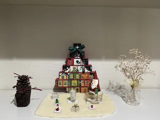家にあった大好きなガラス飾り・拾った松ぼっくり・ケーキの飾り・プレゼントの飾り紐・かすみ草のドライなどお気に入りを並べてみました🎵
