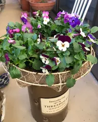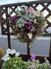 ハンギングバスケット ビオラやパンジー、アリッサム、アイビーなどもりもりにして仕上げました